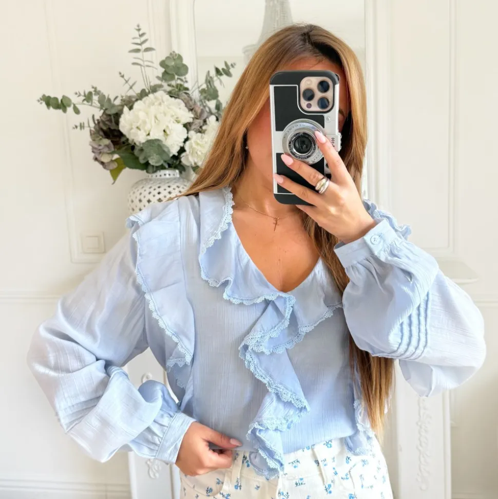 BLOUSE BLEU CIEL VOLANTS