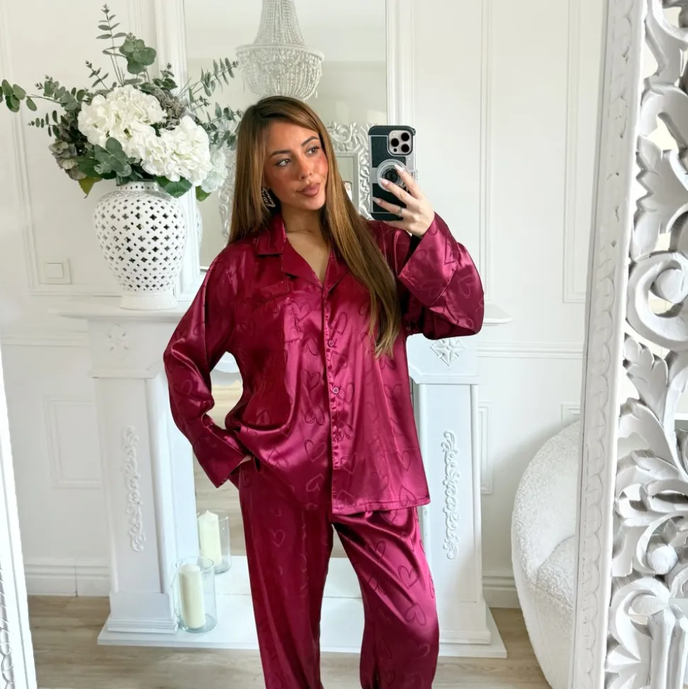 ENSEMBLE PYJAMA SATIN BURGUNDY COEURS